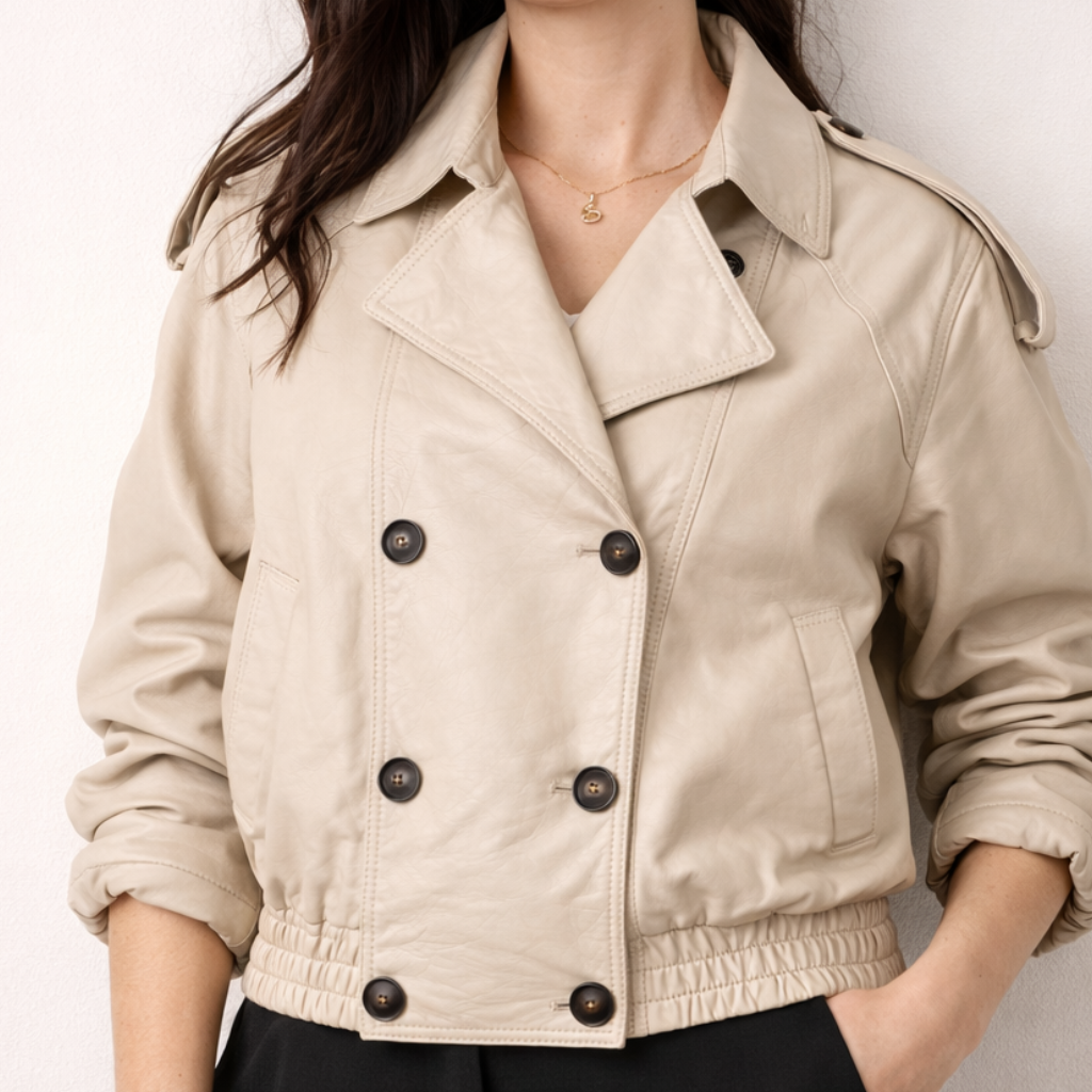 Chaqueta de cuero estilo Bomber, confeccionada en suave cuero de oveja, con un diseño clásico, femenino y un toque de modernidad. Su calce es oversize, por lo tanto muy comoda y versátil. Botonadura tipo trench, terminación de cintura elasticada con el mismo cuero y mangas rectas para usar dobladas o como quieras.